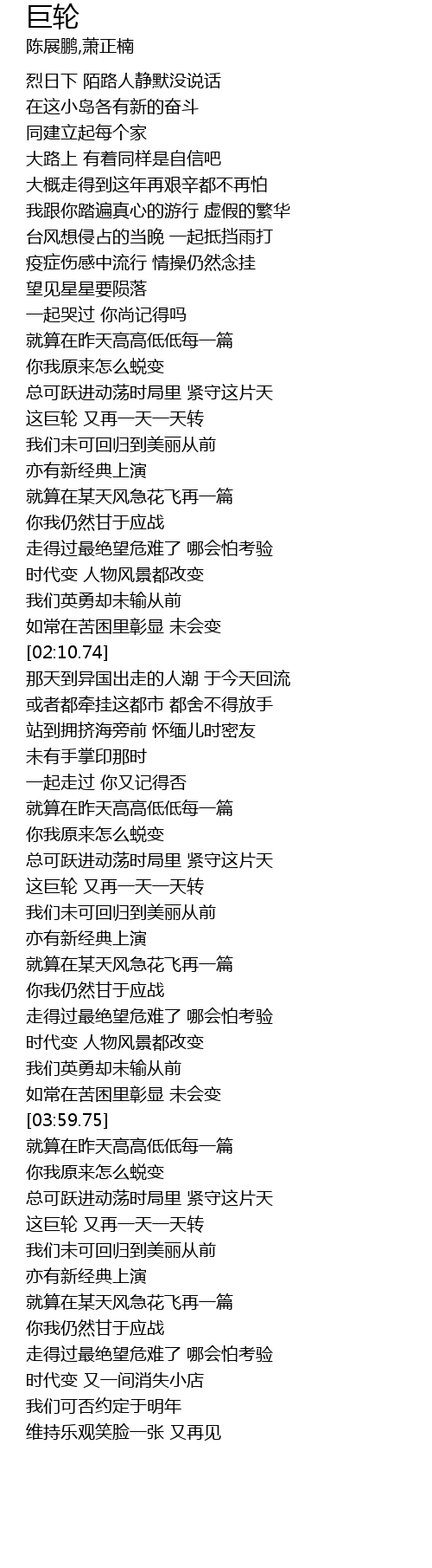| [04:25.70] | 这巨轮 又再一天一天转 |