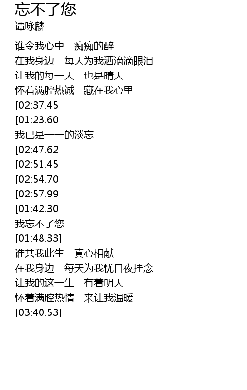 | [03:01.65][01:42.30] | 也忘不了您 |
