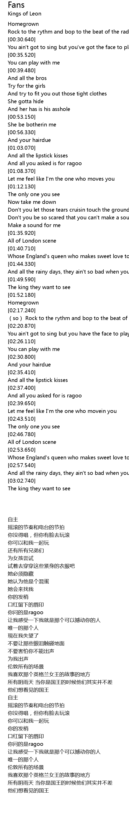 | [02:54.370] | Whose England′s queen who makes sweet love to tales I bring |