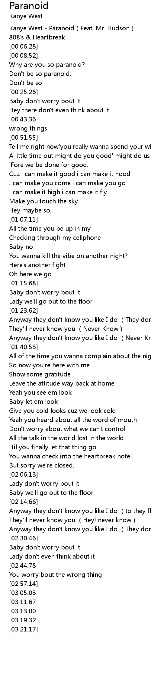 | [00:00.46] | Kanye West - Paranoid(Feat. Mr. Hudson) |