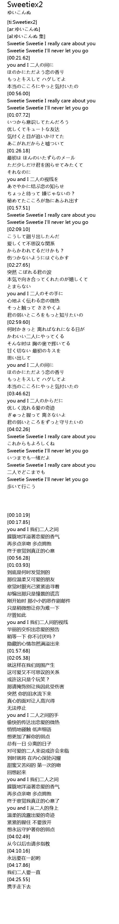 | [04:17.86] | Sweetie Sweetie I really care about you |