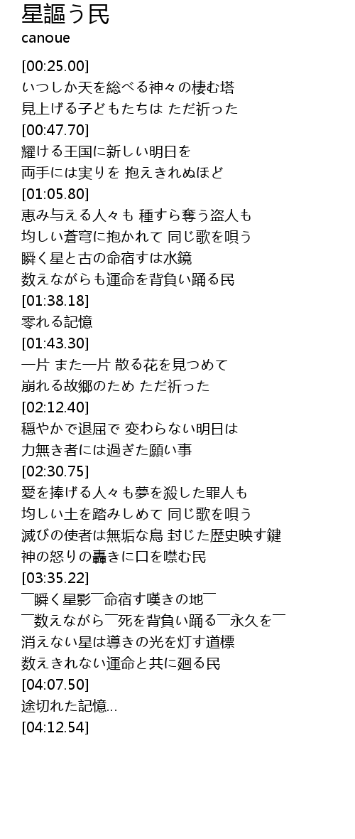 | [04:00.21] | 数えきれない運命と共に廻る民 |