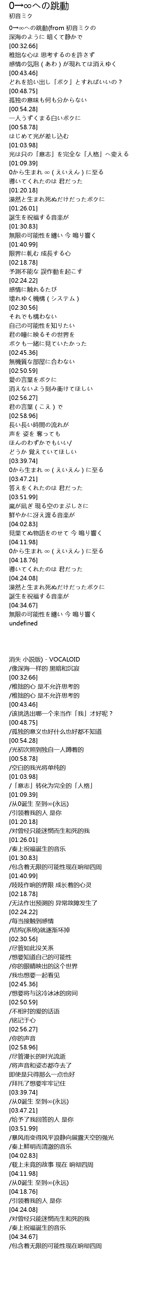 | [00:01.62] | 0→∞への跳動(from 初音ミクの |
