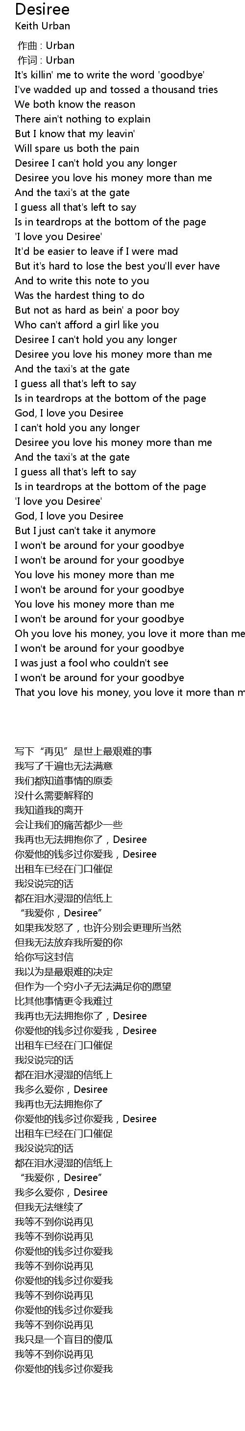 | [03:03.34] | Desiree you love his money more than me |