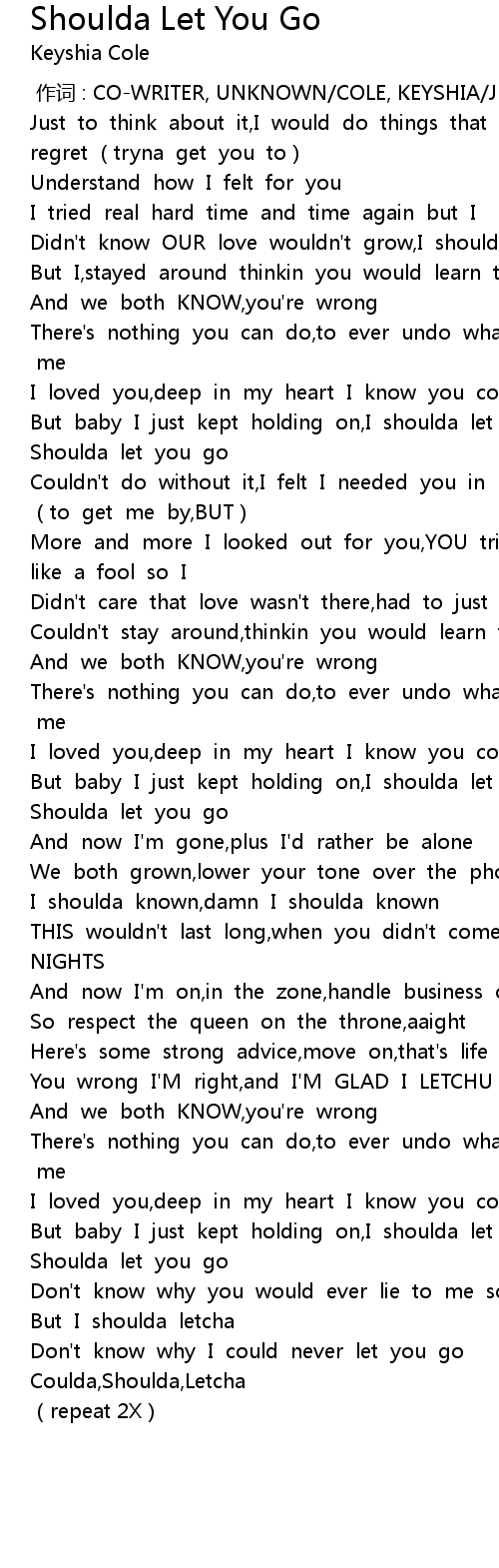 | [02:29.444] | But baby I just kept holding on,I shoulda let you go |