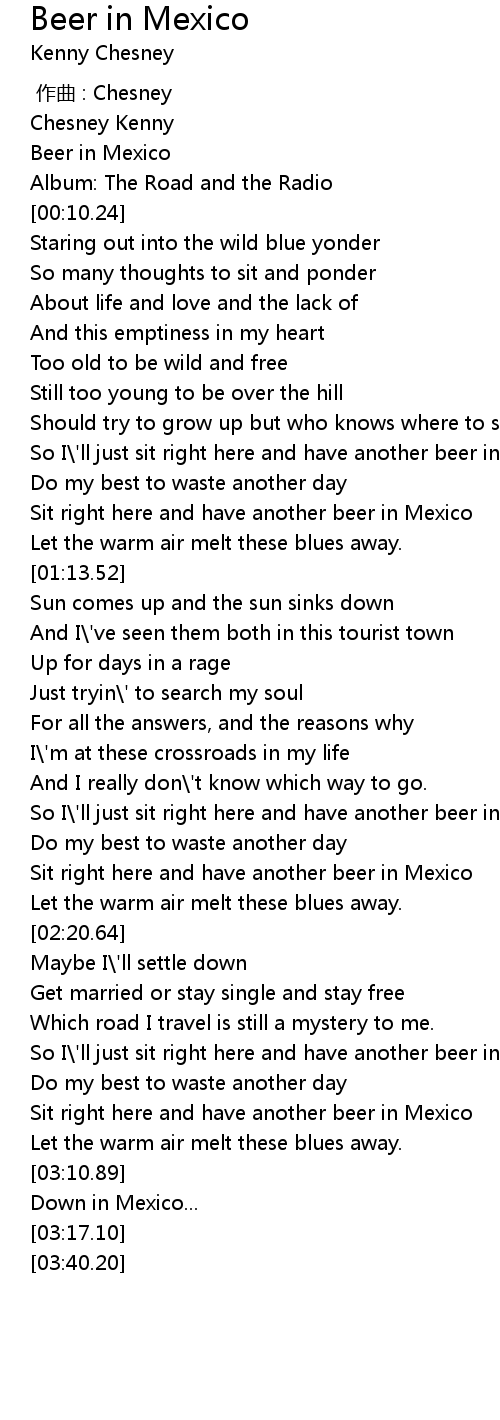 | [01:03.36] | Sit right here and have another beer in Mexico |