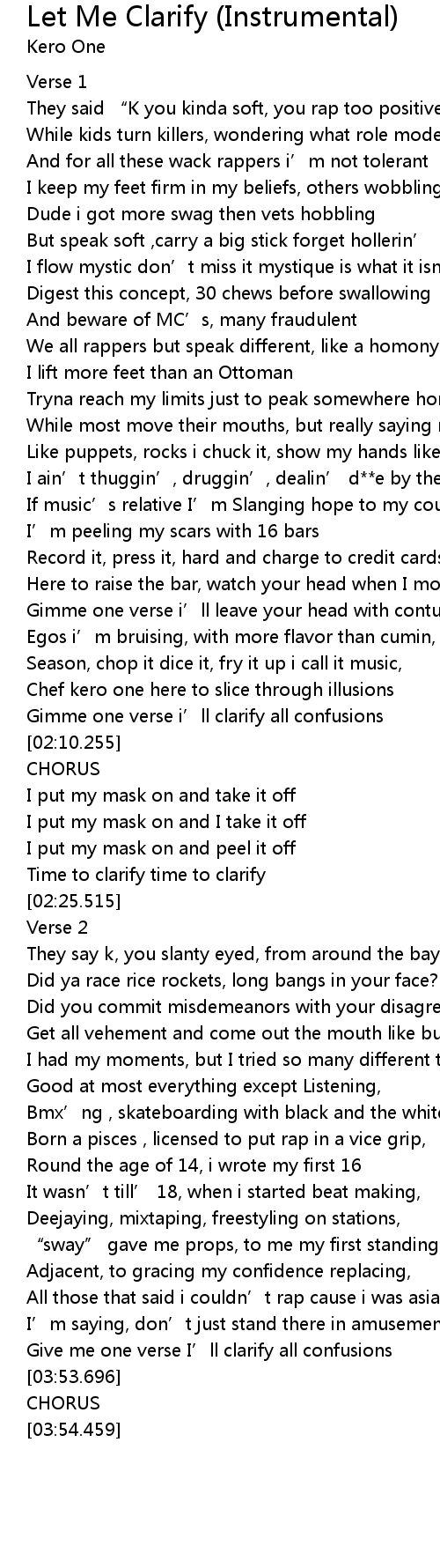 | [02:05.459] | Gimme one verse i’ll clarify all confusions |