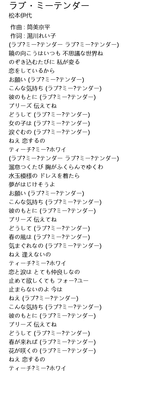 | [01:02.67] | (ラブ?ミー?テンダー ラブ?ミー?テンダー) |