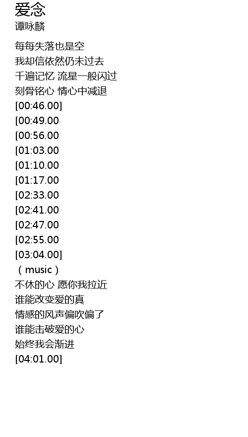 | [03:35.00][02:47.00][01:34.00] | ai nian zhong sheng jin xian chu xin zhong ai yi fen |