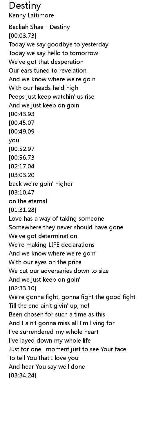 | [03:18.02][03:03.20][02:17.56][01:16.59][01:00.70] | Your DESTINY. Ain't turning back we're goin' higher |