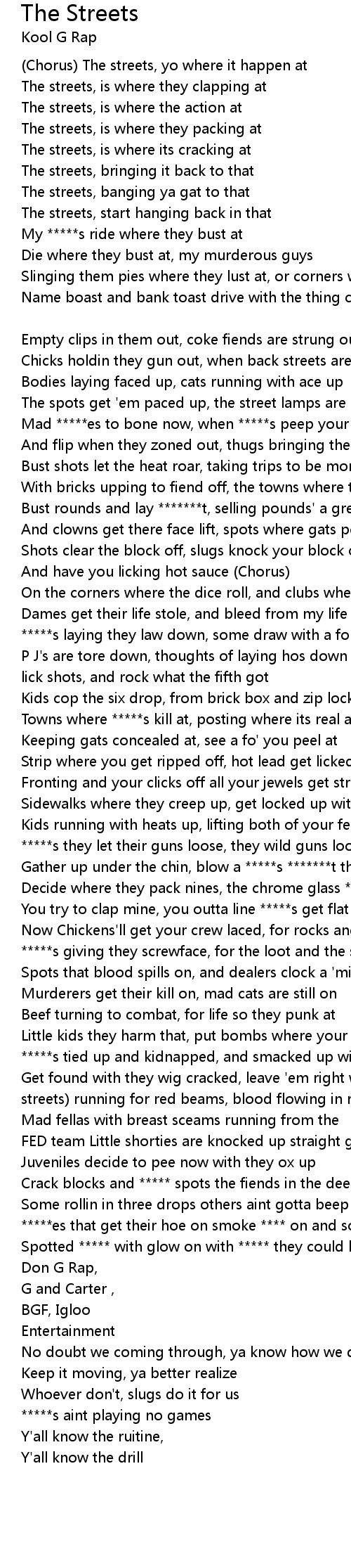 P J's are tore down, thoughts of laying hos down (The streets) blocks where they lick shots, and rock what the fifth got |