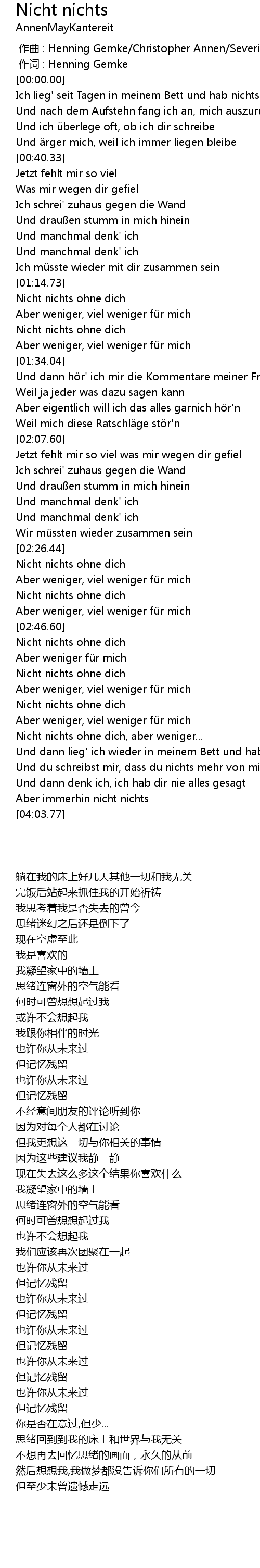 | [03:34.67] | Nicht nichts ohne dich |