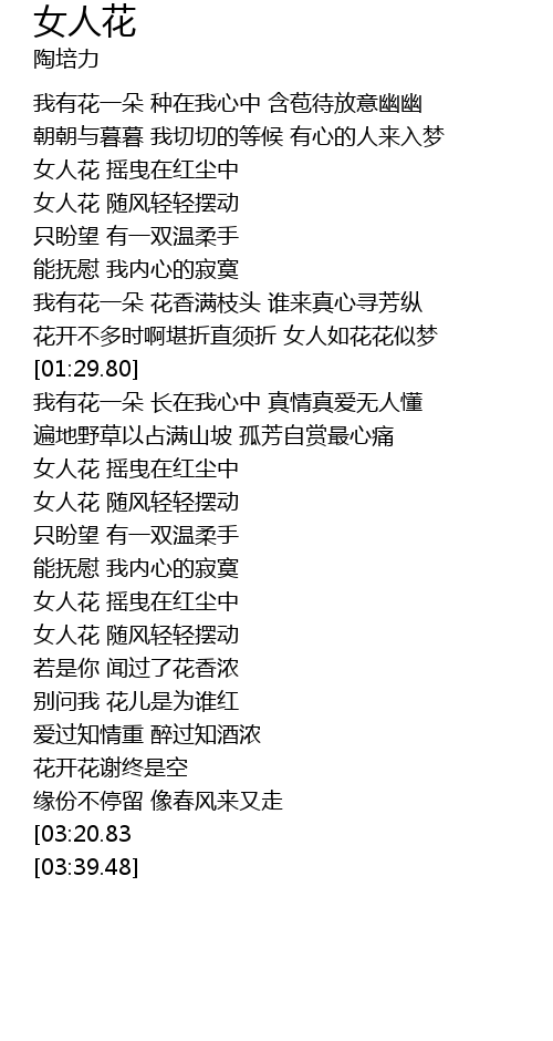 | [03:31.23][03:20.83] | 女人如花花似梦 |