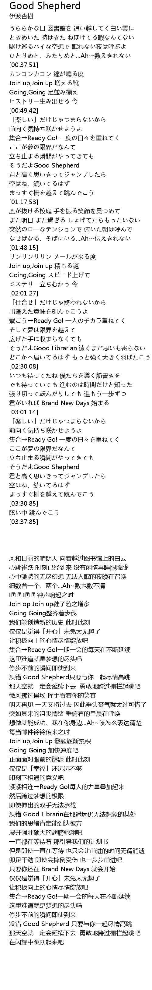 | [03:18.75] | そうだよGood Shepherd 君と高く思いきってジャンプしたら |