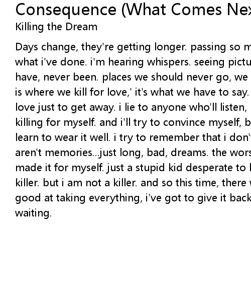 Days change, they're getting longer. passing so much faster. reminding me of what i've done. i'm hearing whispers. seeing pictures of what could have, should have, never been. places we should never go, we swore we'd never go again. 'this is where we kill for love,' it's what we have to say. this is where i killed for love just to get away. i lie to anyone who'll listen, but i know i'm only killing for myself. and i'll try to convince myself, but maybe i should just learn to wear it well. i try to remember that i don't want to forget. these aren't memories...just long, bad, dreams. the worst kind of nightmare, and i made it for myself. just a stupid kid desperate to love...and he becomes a killer. but i am not a killer. and so this time, there won't be a next time. so good at taking everything, i've got to give it back. this time, i am ready. i am waiting. |