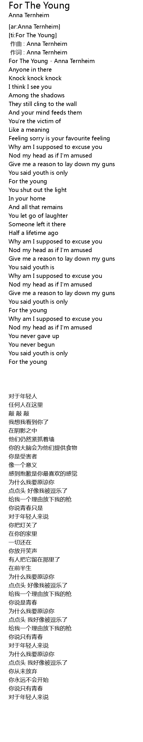 | [00:00.91] | For The Young - Anna Ternheim |
