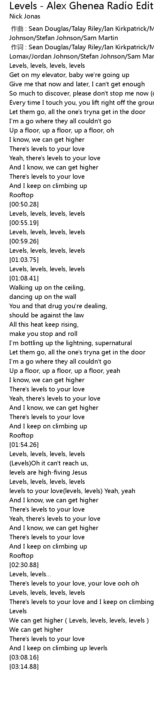 | [02:08.31] | levels to your love levels, levels Yeah, yeah |