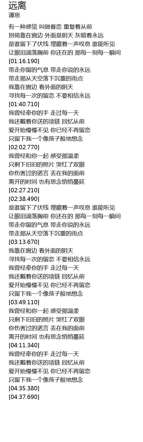 | [00:44.710] | bié yǐ kào zài chuāng biān wài miàn shì yīn tiān huī àn zhe yǒng yuǎn |