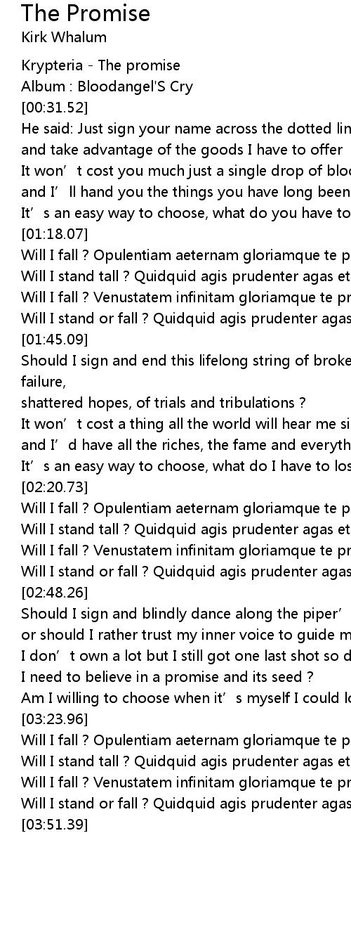| [03:42.56] | Will I stand or fall ? Quidquid agis prudenter agas et respice finem |