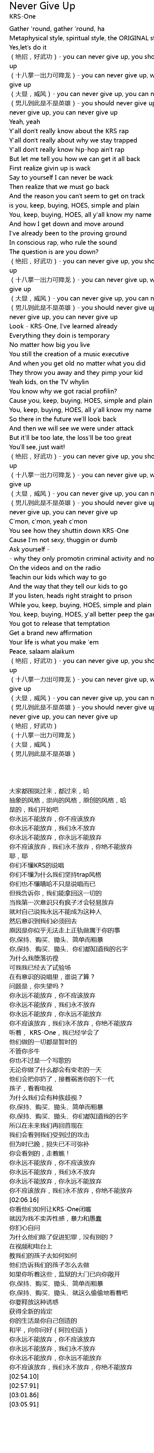 | [01:54.49] | (十八掌一出力可降龙)- you can never give up, we can never give up |