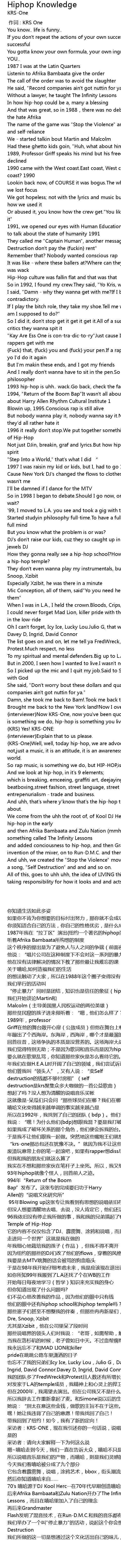 | [03:55.430] | {KRS-One}Well, well, today hip-hop, we are advocating that hip-hop is not,just a music, it is an attitude, it is an awareness, it is a way to view the world. |