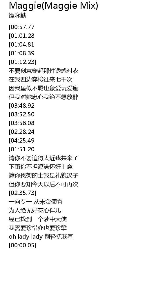 | [04:03.18][03:48.92][02:17.52][01:32.91] | my my my my maggie 是心中拍子 |