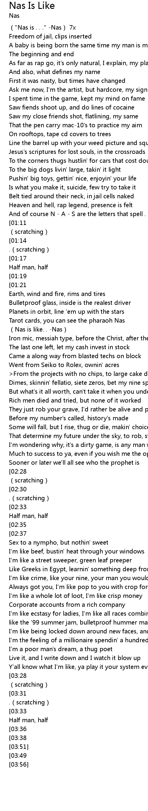 | [03:44][03:33] | Nas is like .(scratching) . Nas is like . (scratching). . Half man, half |