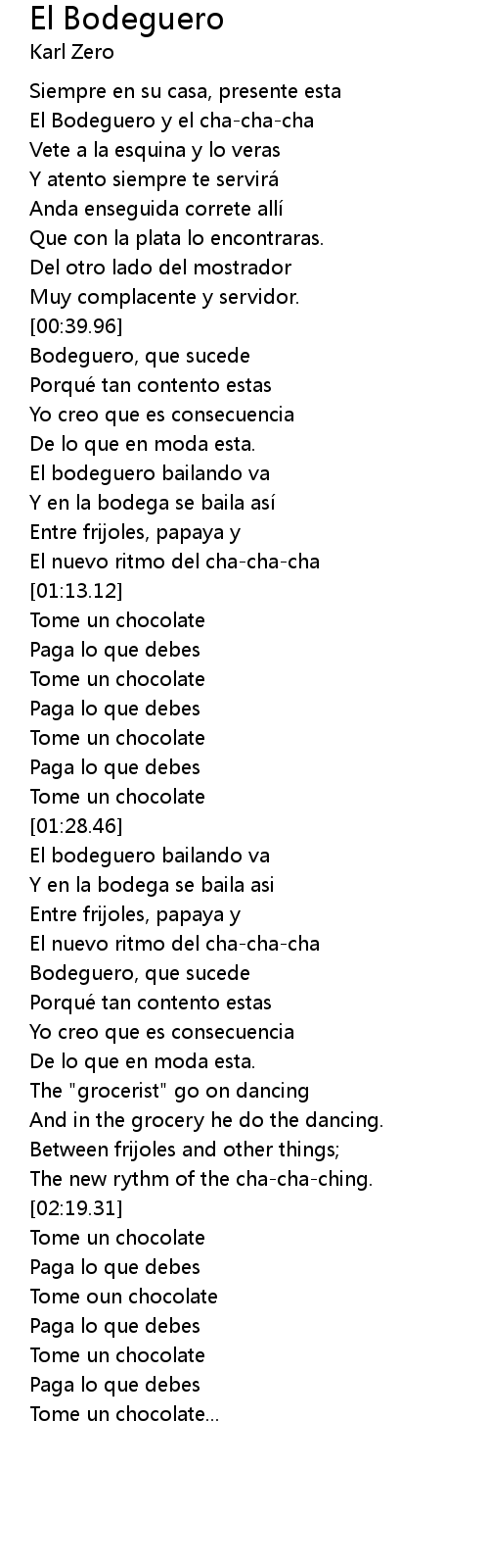 | [00:12.15] | El Bodeguero y el cha-cha-cha |