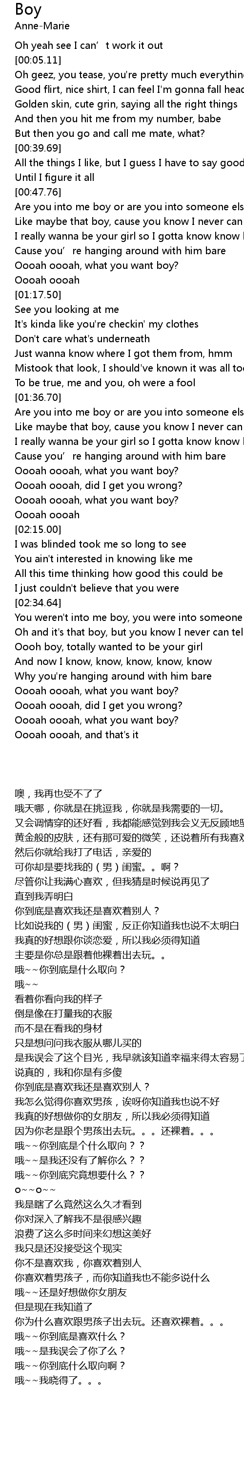 | [00:48.70] | Are you into me boy or are you into someone else? |