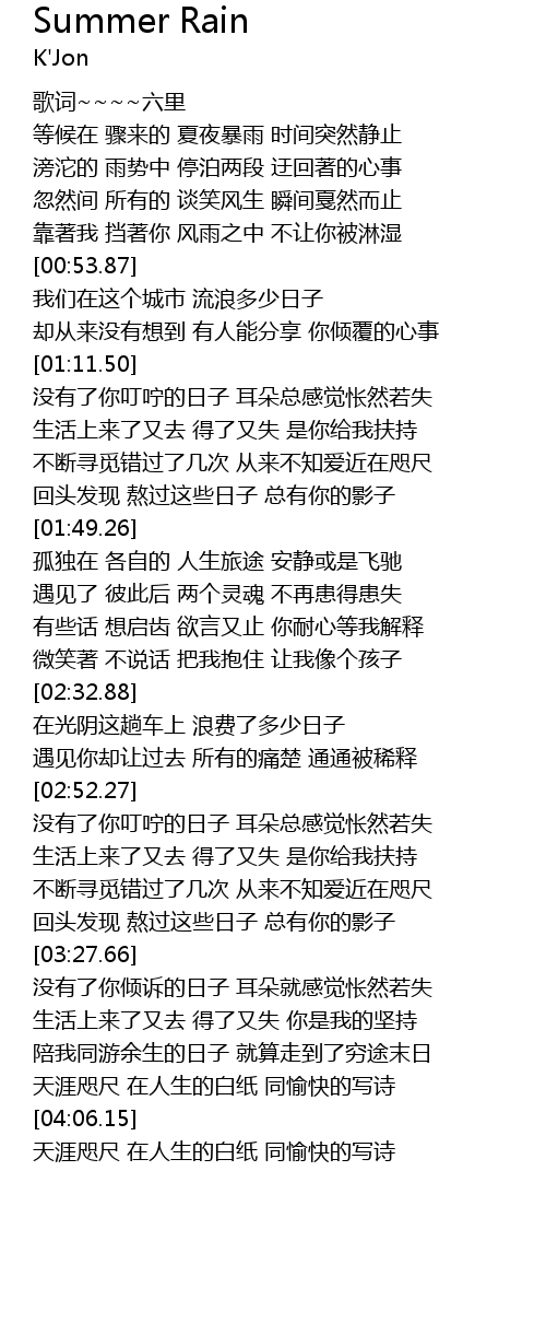 | [00:21.67] | 等候在 骤来的 夏夜暴雨 时间突然静止 |