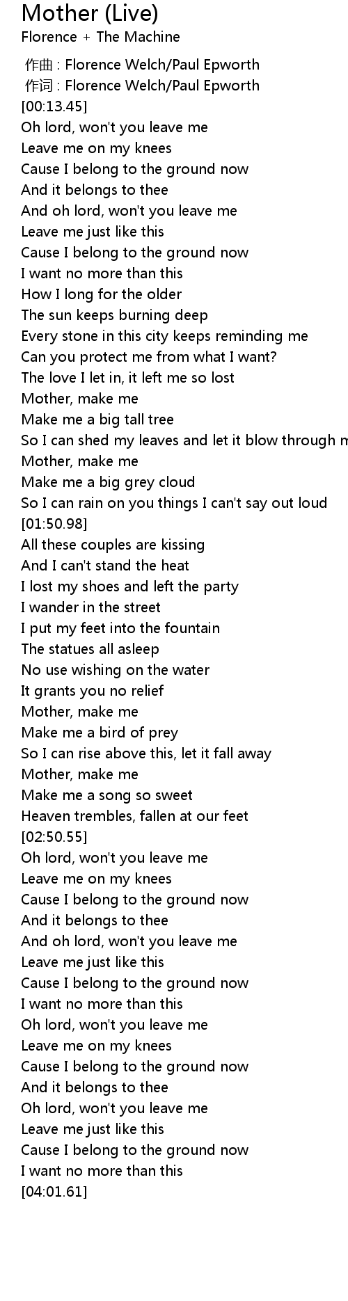 | [00:01.00] | 作词 : Florence Welch/Paul Epworth |