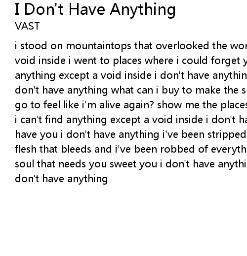 i stood on mountaintops that overlooked the world i can't find anything except a void inside i went to places where i could forget your name i can't find anything except a void inside i don't have anything because i don't have you i don't have anything what can i buy to make the sky turn blue again? where can i go to feel like i'm alive again? show me the places where i can forget your name i can't find anything except a void inside i don't have anything because i don't have you i don't have anything i've been stripped of everything except some flesh that bleeds and i've been robbed of everything except a soul, except a soul that needs you sweet you i don't have anything because i don't have you i don't have anything |