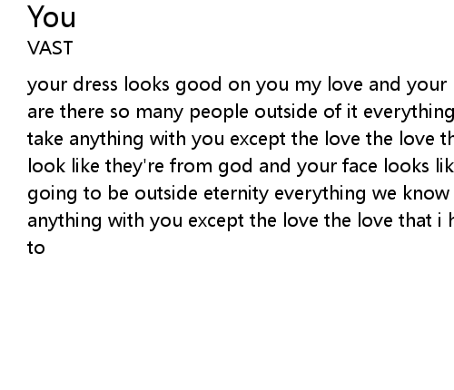 | your dress looks good on you my love and your house looks like it's heaven why are there so many people outside of it everything you have will be oh you can't take anything with you except the love the love that i have for you your eyes look like they're from god and your face looks like it's from god why are you going to be outside eternity everything we know will be oh you can't take anything with you except the love the love that i have for you i know you want to |