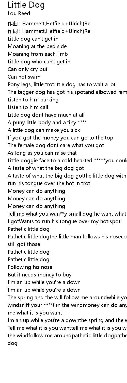 | Tell me what it is you wanttell me what it is you wantyou sniff your t in the windfollow me aroundpathetic little dogpathetic little dogpathetic little dog |