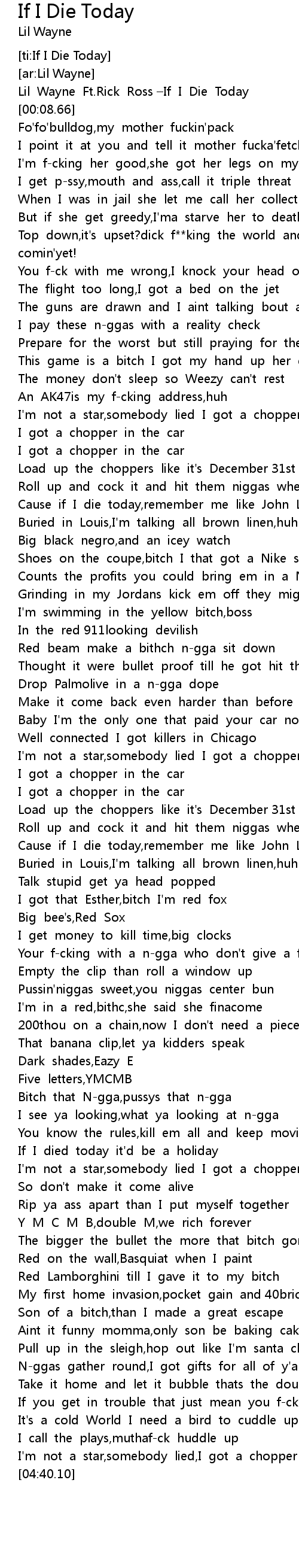 | [00:01.87] | Lil Wayne Ft. Rick Ross If I Die Today |