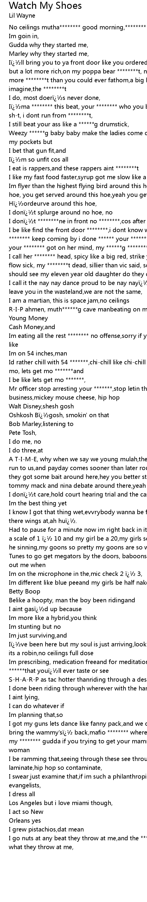 | I call her ******** head, spicy like a big red, strike you like a bic headyour flow sick, my ********t dead, sillier than vic said, soulja boy and arab,you should see my eleven year old daughter do they dance, | |