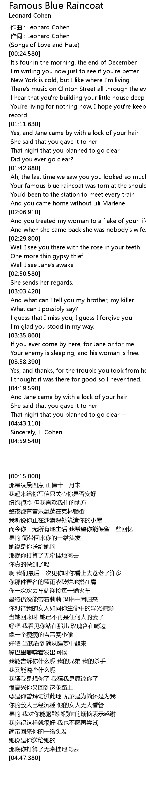| [01:49.680] | Your famous blue raincoat was torn at the shoulder |