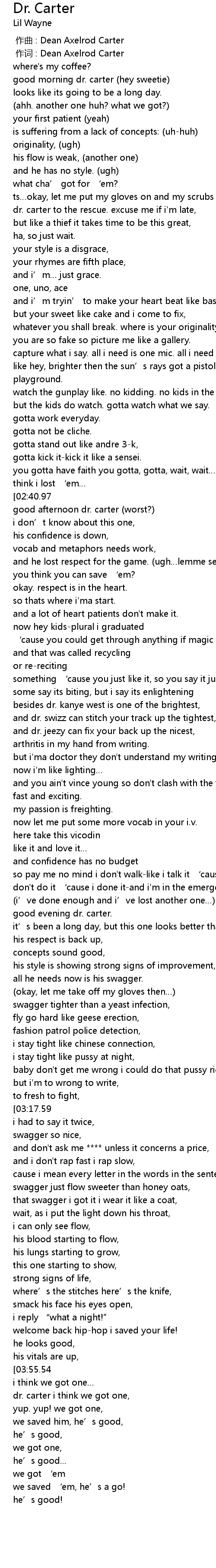 | [00:23.82] | dr. carter to the rescue. excuse me if i' m late, |