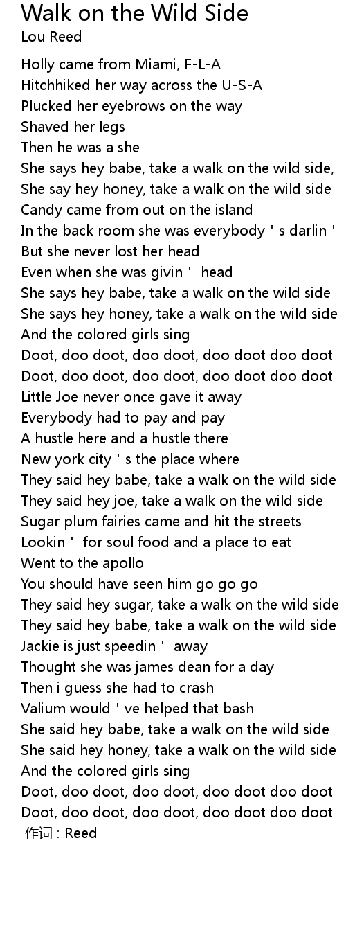 | [01:11] | She says hey honey, take a walk on the wild side |