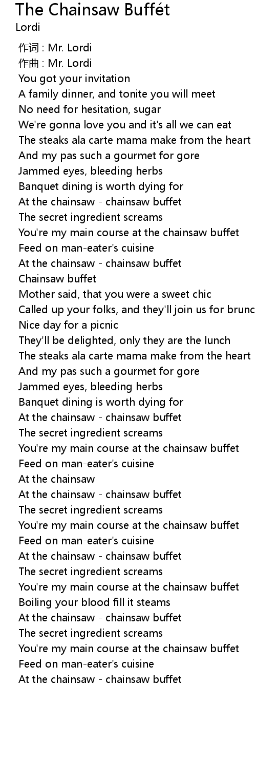 | [02:59.482] | At the chainsaw chainsaw buffet |