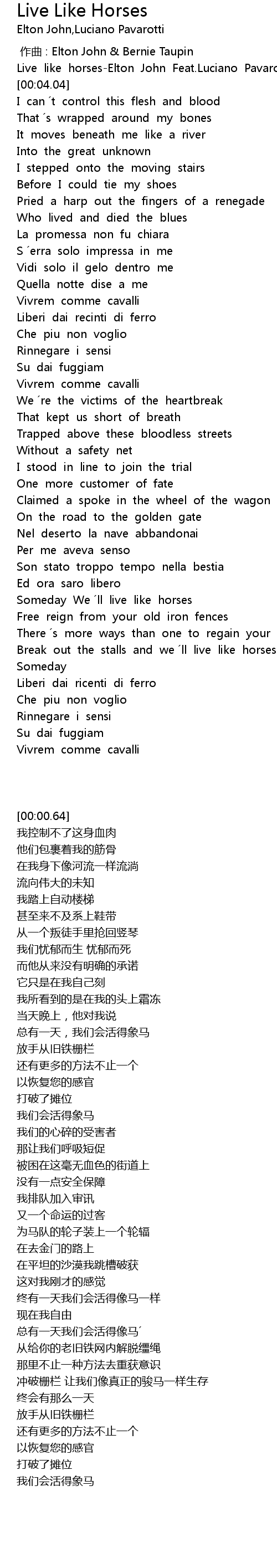 | [00:00.64] | Live like horses-Elton John Feat.Luciano Pavarotti |