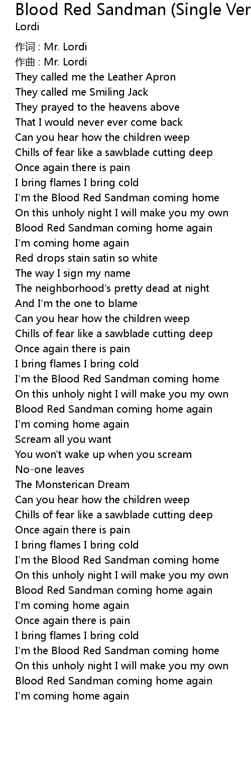 | [03:20.212] | I' m the Blood Red Sandman coming home |