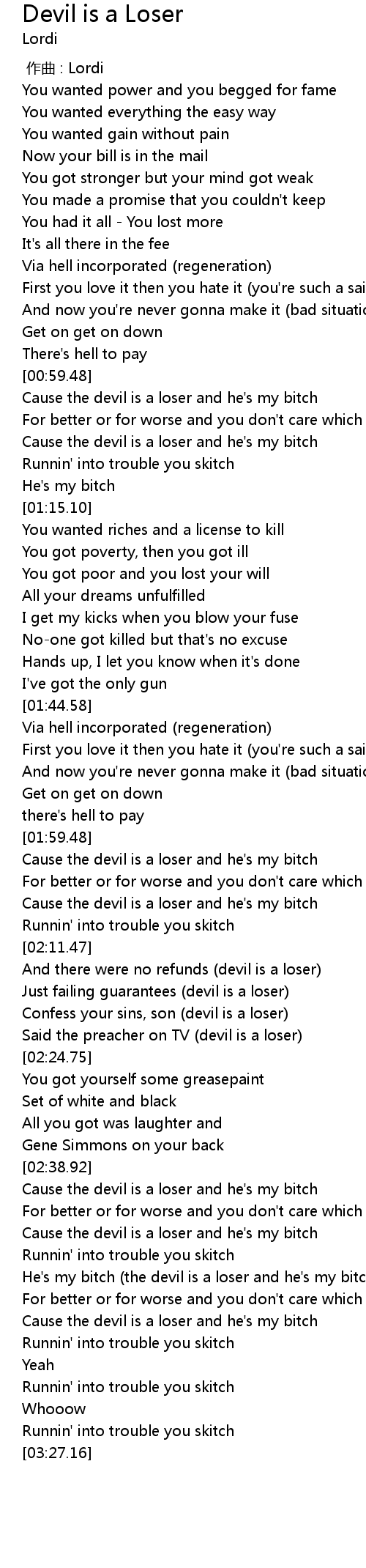 | [03:00.93] | Cause the devil is a loser and he' s my bitch |