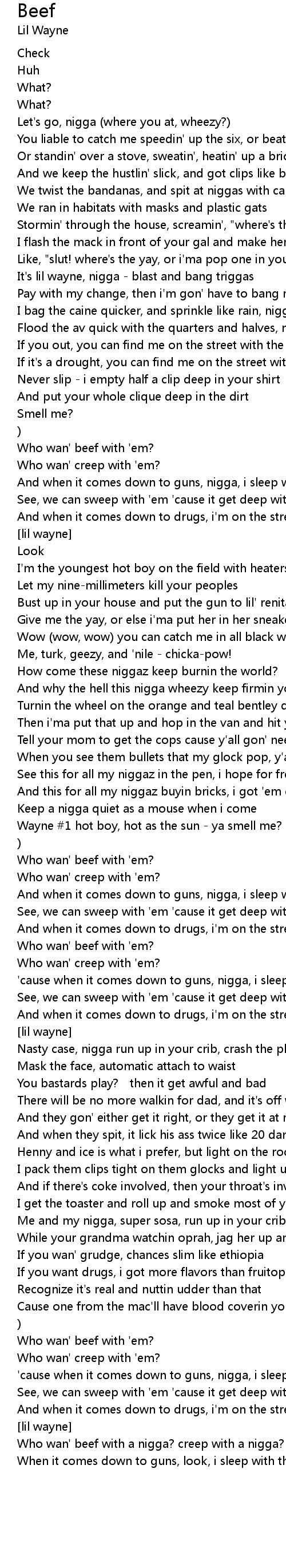 | Who wan' beef with a nigga? creep with a nigga? | |