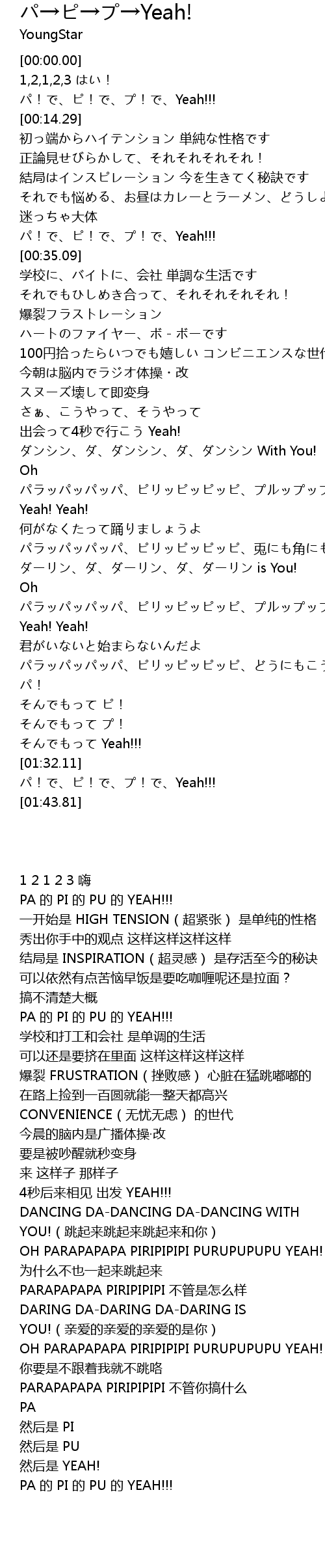 | [01:38.56] | パ!で、ピ!で、プ!で、Yeah!!! |