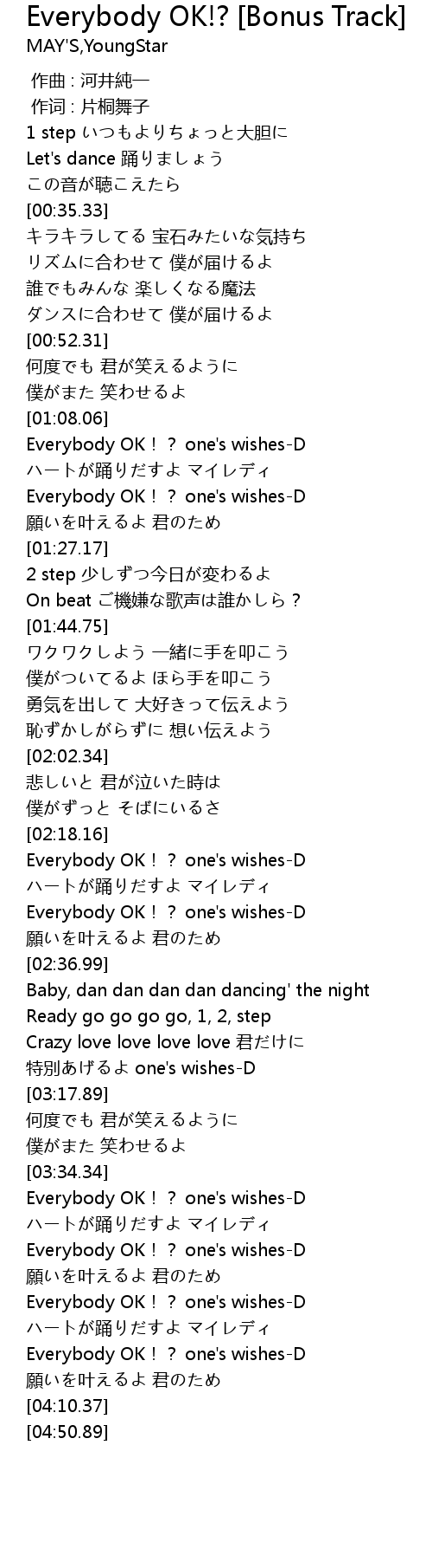 | [03:59.67] | Everybody OK!? one' s wishesD |