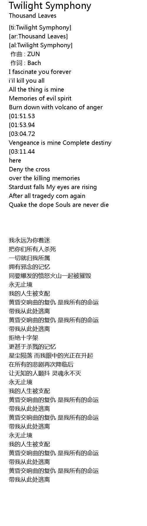 | [03:13.59][03:04.72][02:06.54][01:57.30][01:10.47][01:01.22] | Twilight symphony Vengeance is mine Complete destiny |
