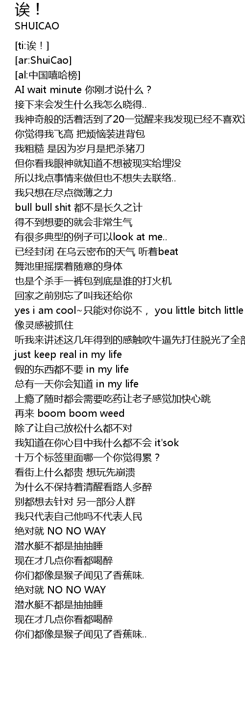 | [01:01.94] | yes i am cool zhǐ néng duì nǐ shuō bù, you little bitch little bitch xiàng líng gǎn bèi zhuā zhù |