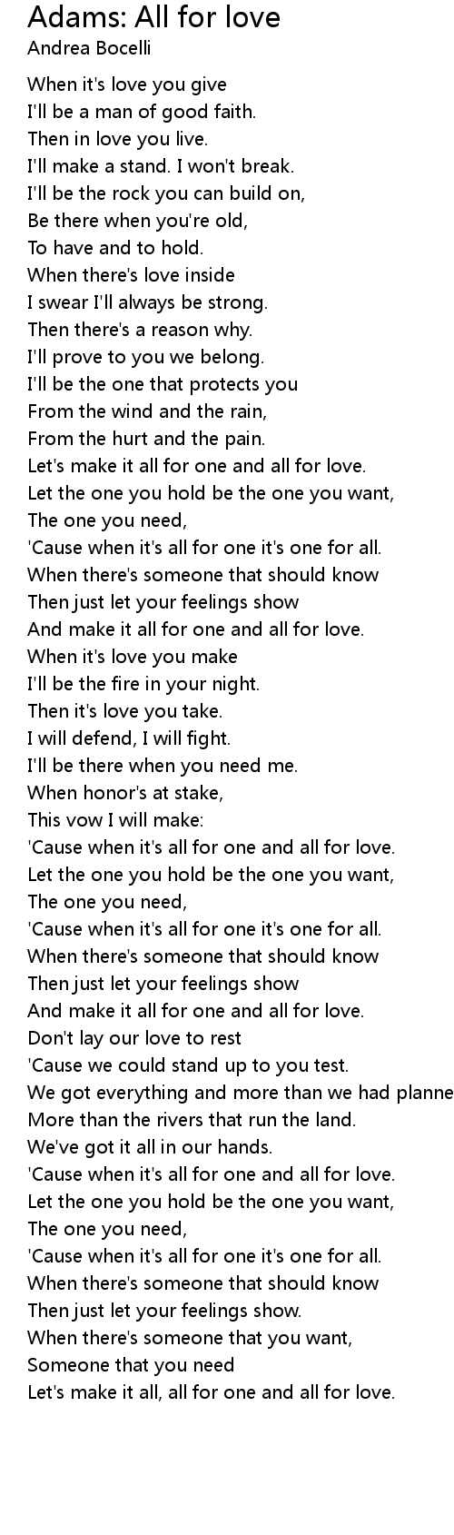 'Cause when it's all for one and all for love. |