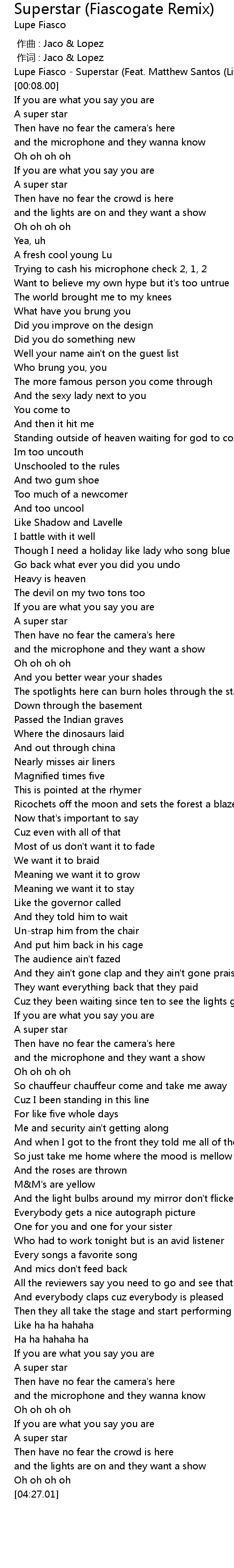 | [00:02.00] | Lupe Fiasco - Superstar (Feat. Matthew Santos (Live) |